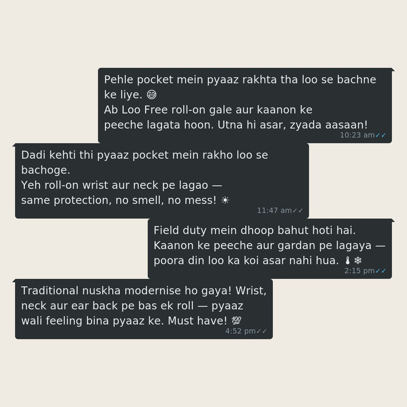 Loo Free Roll-On works by releasing a instant cooling sensation on your underarms when applied. Its lightweight formula absorbs quickly into the skin, regulating the body's surface temperature and creating a heat-shield effect against loo (hot dry summer winds). It neutralises sweat odour at the source and keeps you feeling fresh for hours — no white cast, no stickiness, just cool protection all day.