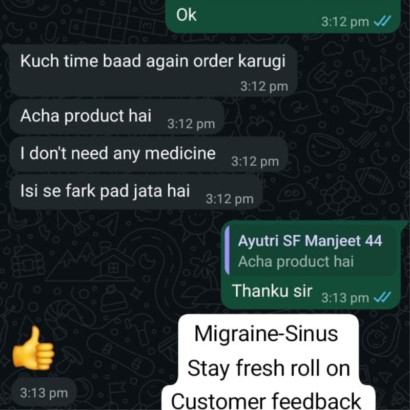 2025PPriya SharmaVerified Buyer“Instant Migraine Relief!”I get sudden migraines during work and this roll-on has been a lifesaver. Within 2–3 minutes I feel the cooling effect and my head becomes lighter. Carrying it in my handbag has become a habit now.Was this helpful? 66 2